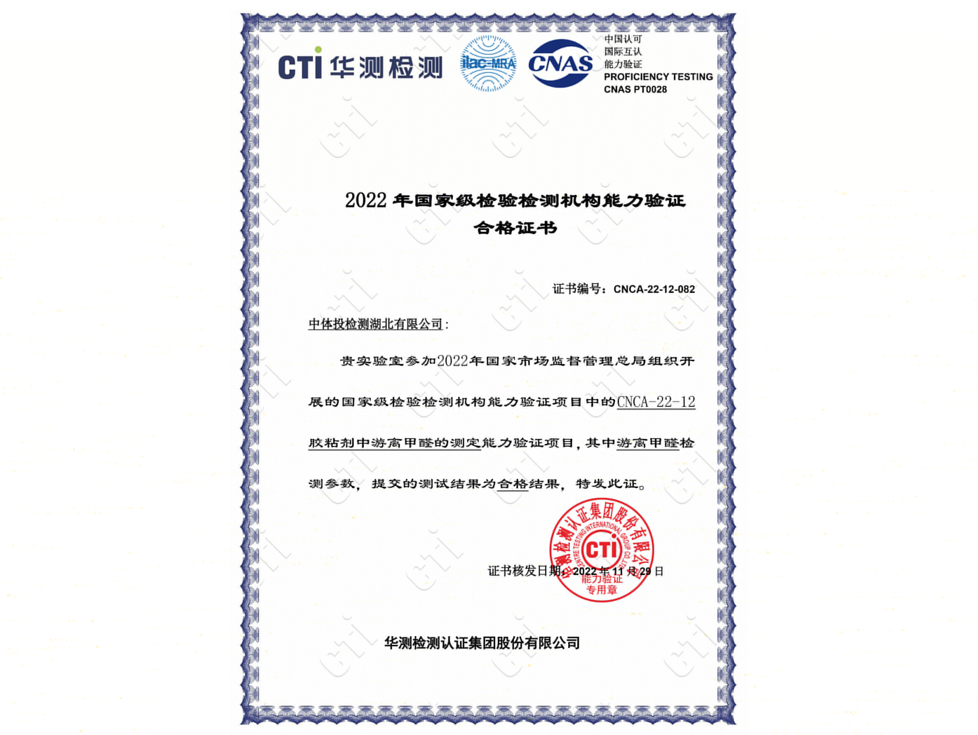 2022年《胶粘剂中游离甲醛的测定》满意证书